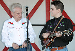 Dr. Ralph Stanley admires the crafstmanship of Nathan Stanley’s mandolin, one of the first Stanley Tones produced by Hill Mandolins